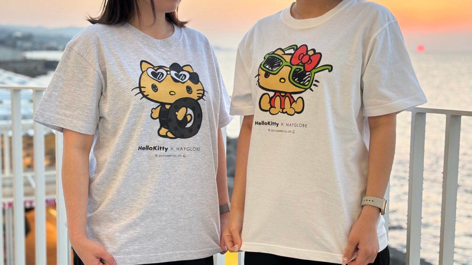 浮き輪を持ち、サングラスを頭にのせたハローキティが描かれた、夏らしいリゾート感あふれるデザイン。